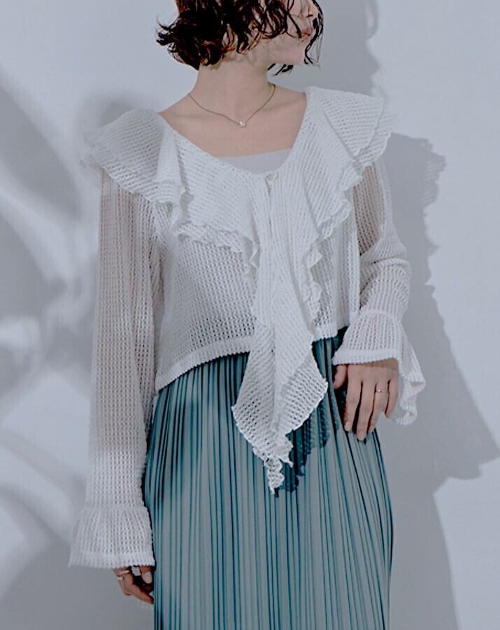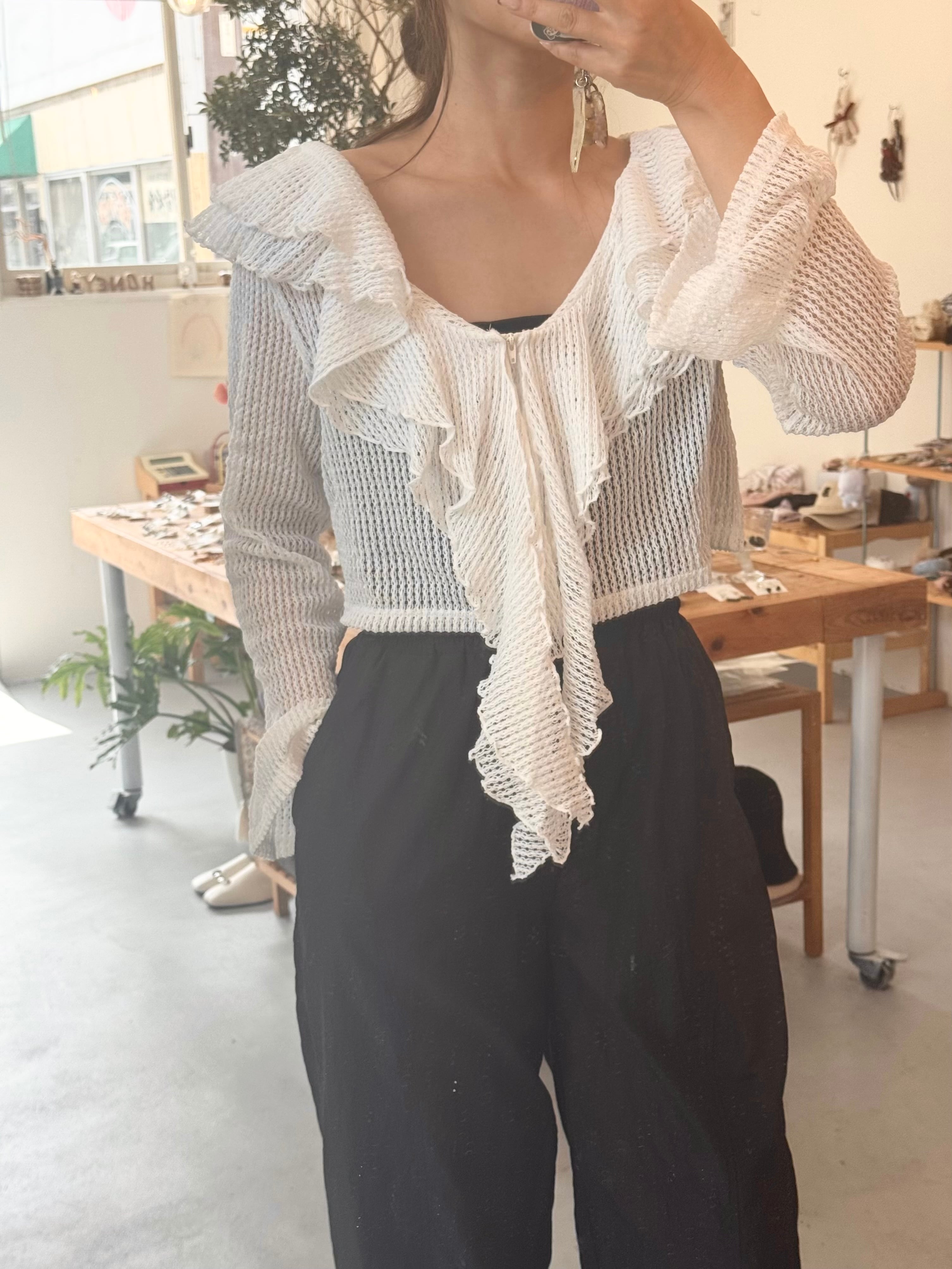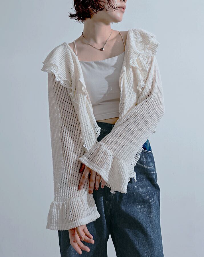 ●ジップ仕様で気軽に羽織れる、メッシュ素材のショートカーディガン
