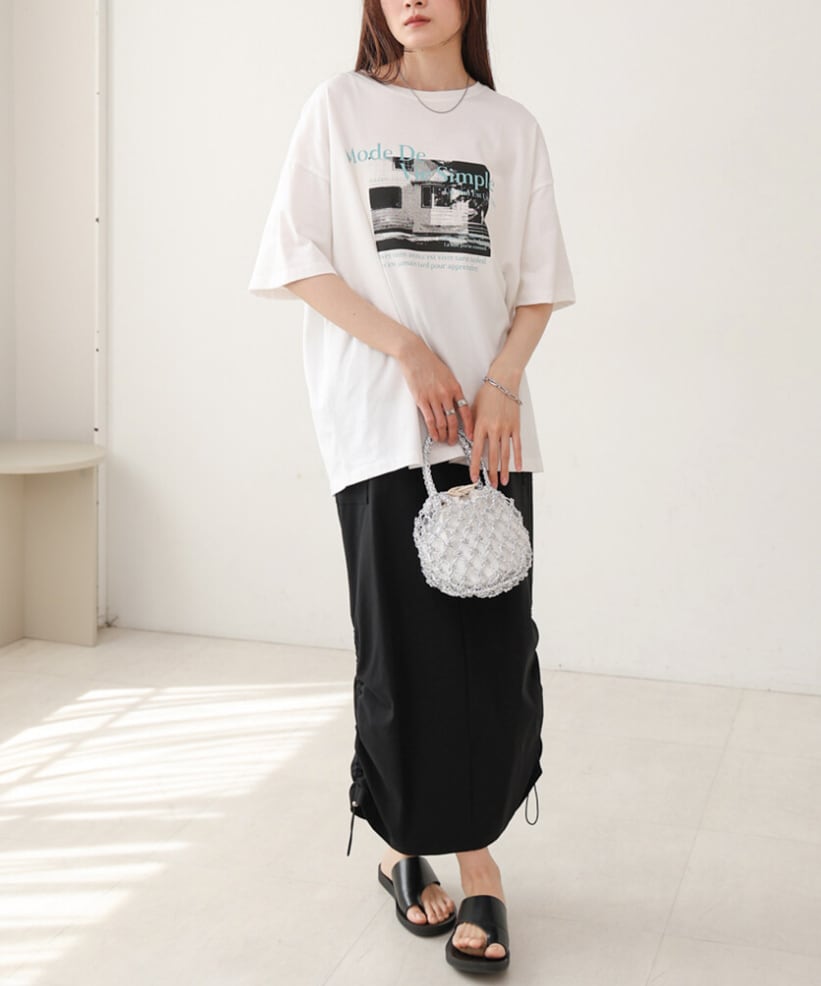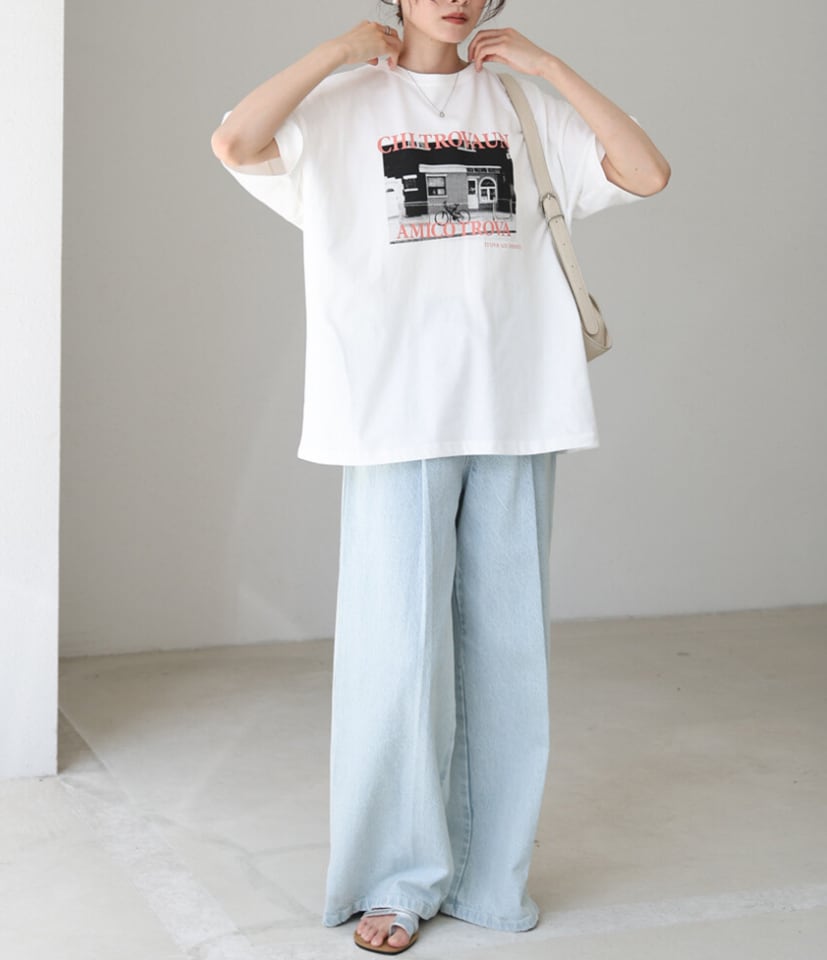 ナチュラルカラーのプリーツスカートやワイドパンツに合わせれば、ほどよく甘さをプラスした淡色コーデに仕上がります。足元は白やベージュのスニーカーやバレエシューズで軽やかに、バッグや帽子はくすみカラーでまとめると全体がふんわり優しい印象に。Tシャツはオーバーサイズでゆるっと着るのがおすすめ。