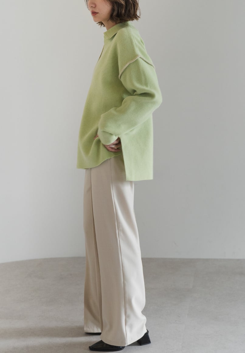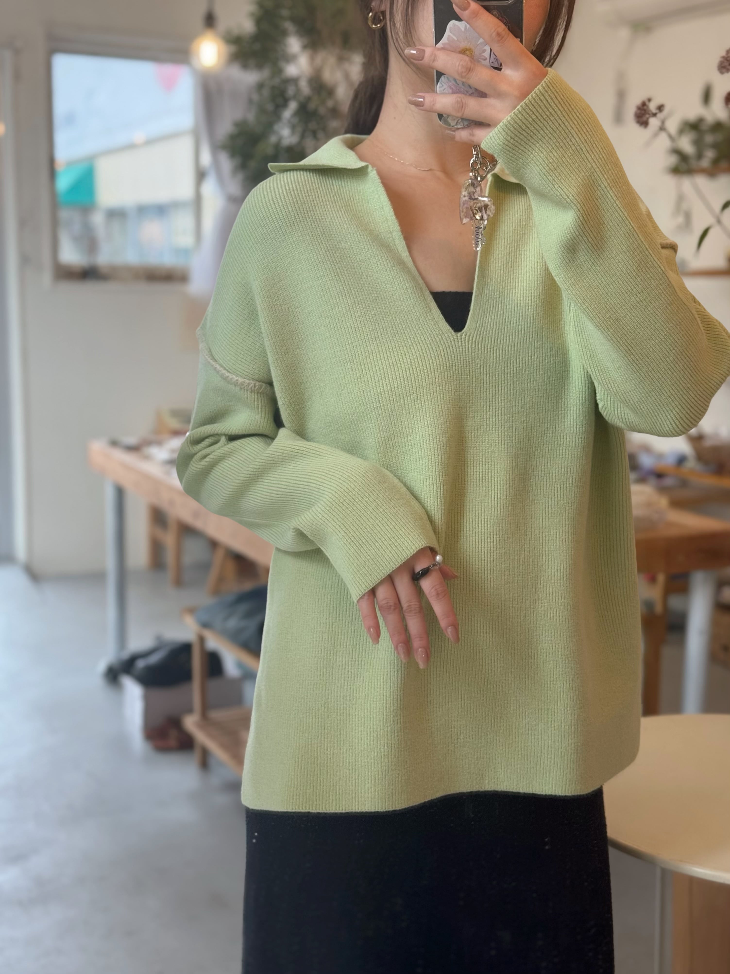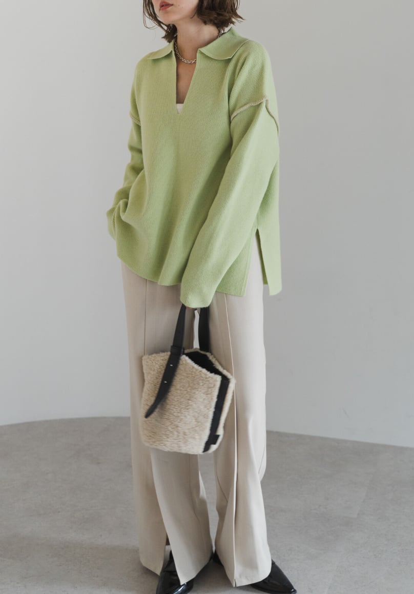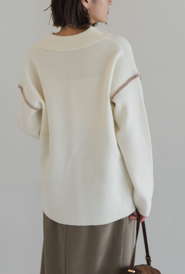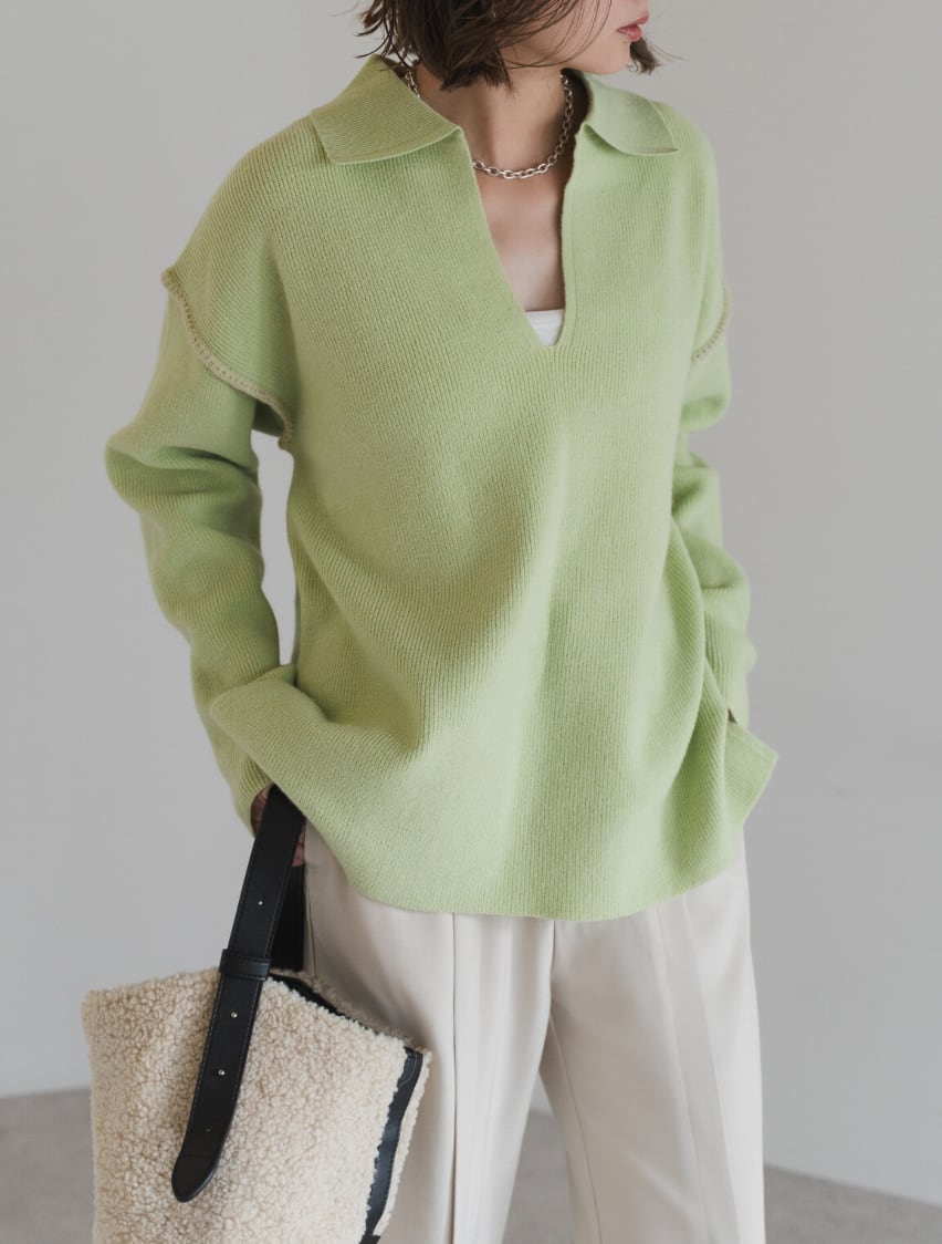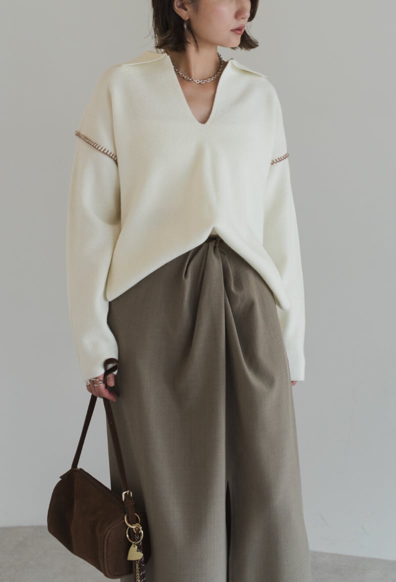 襟付きデザインとスキッパーネックが抜け感を演出するニットプルオーバー。