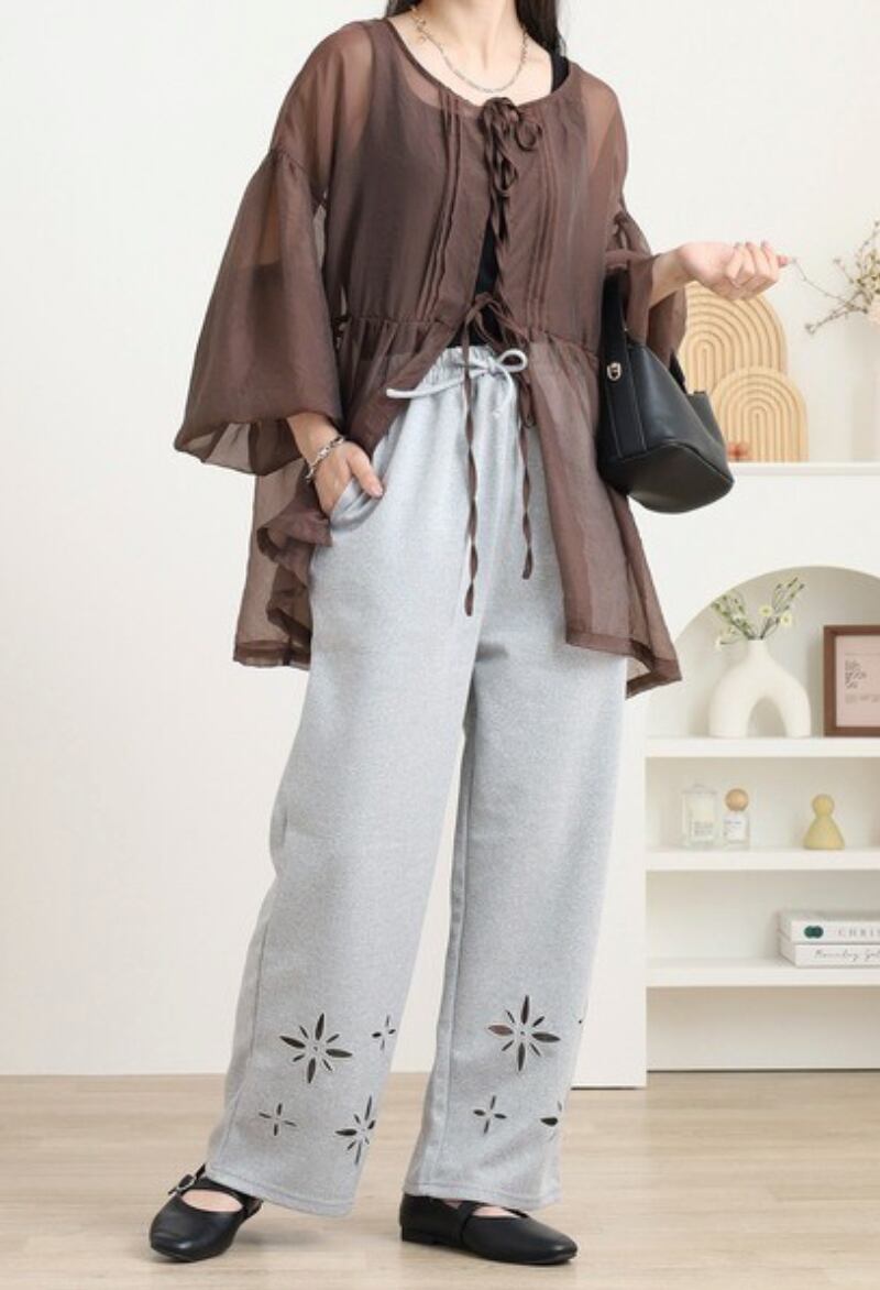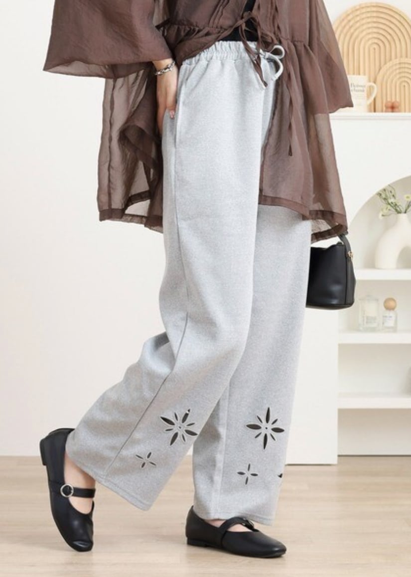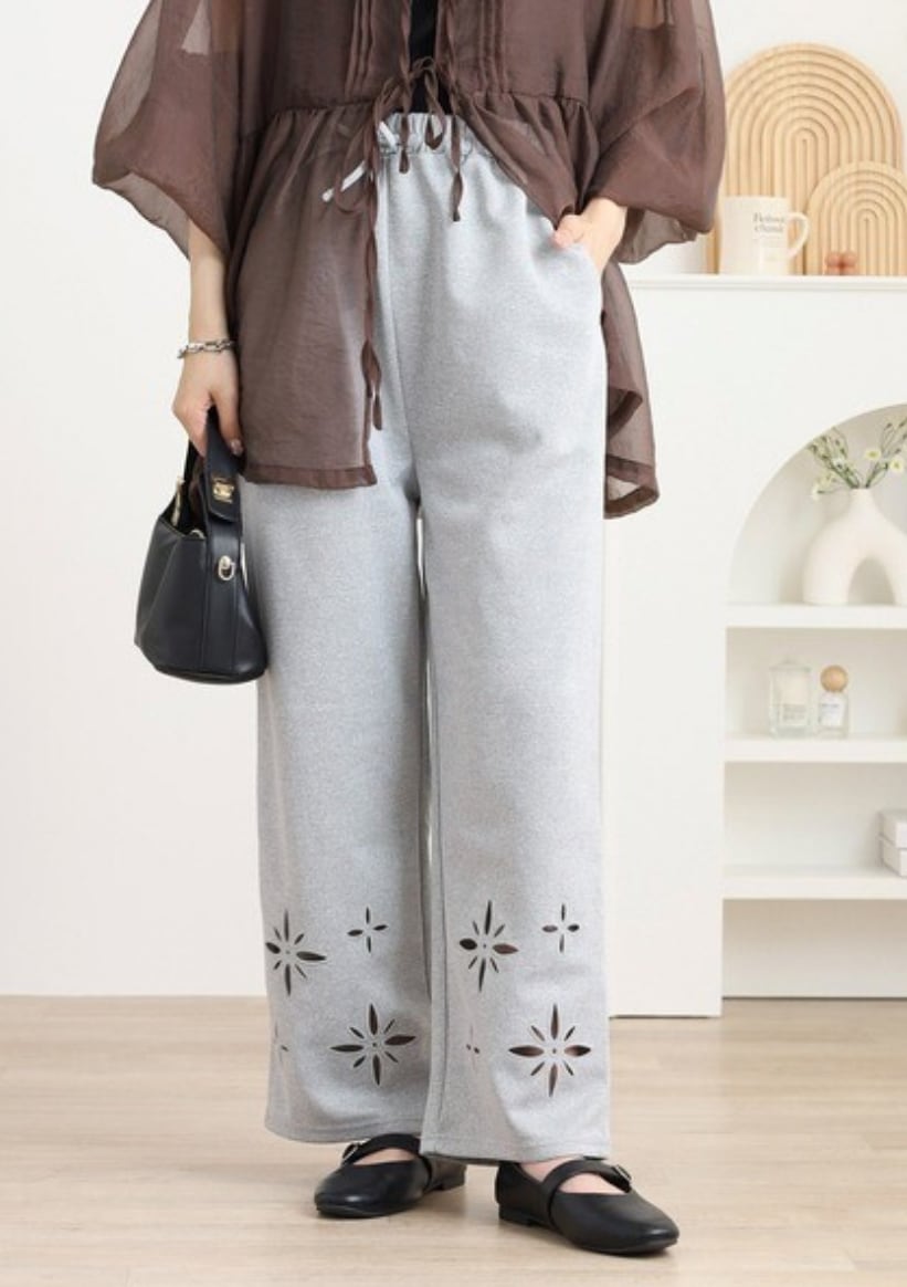シンプルなストレートシルエットに、花柄モチーフのカットアウトデザインを施したワイドパンツ.