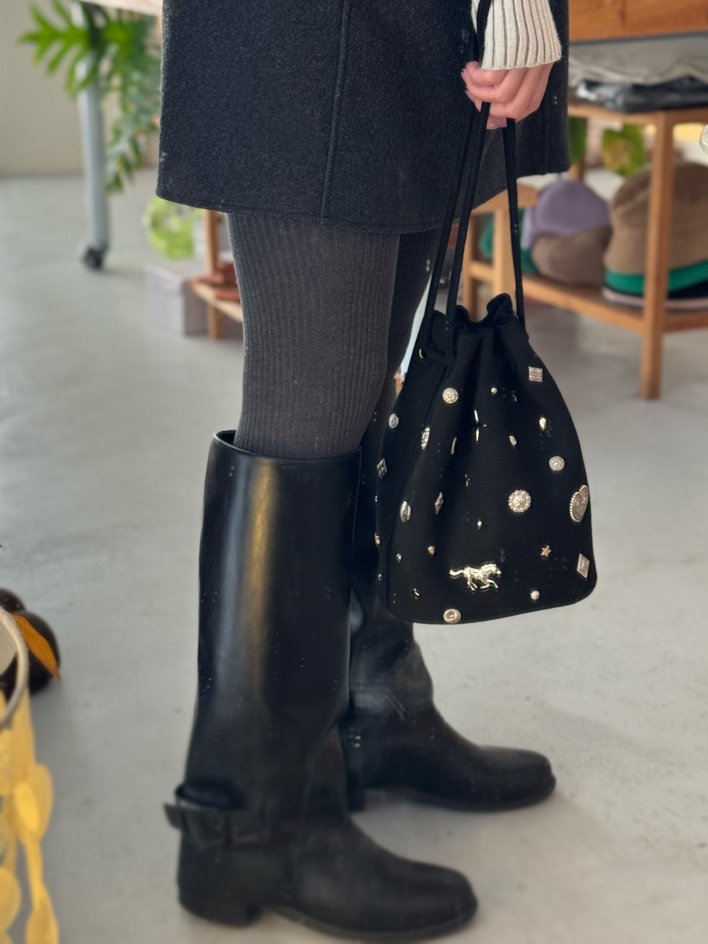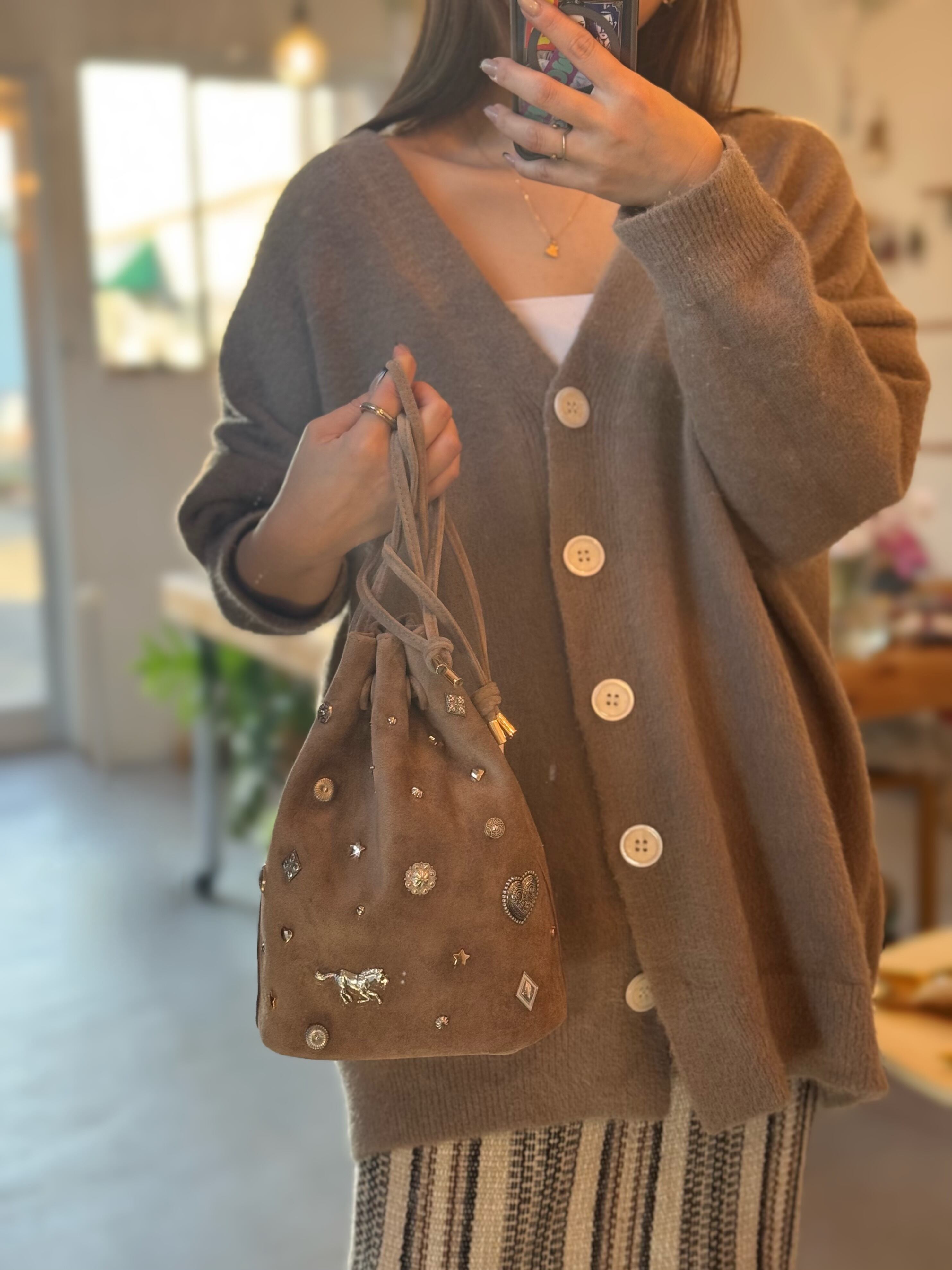 柔らかなフェイクスエード素材に、コンチョやスタッズでアクセントを加えた巾着型ショルダーバッグです。