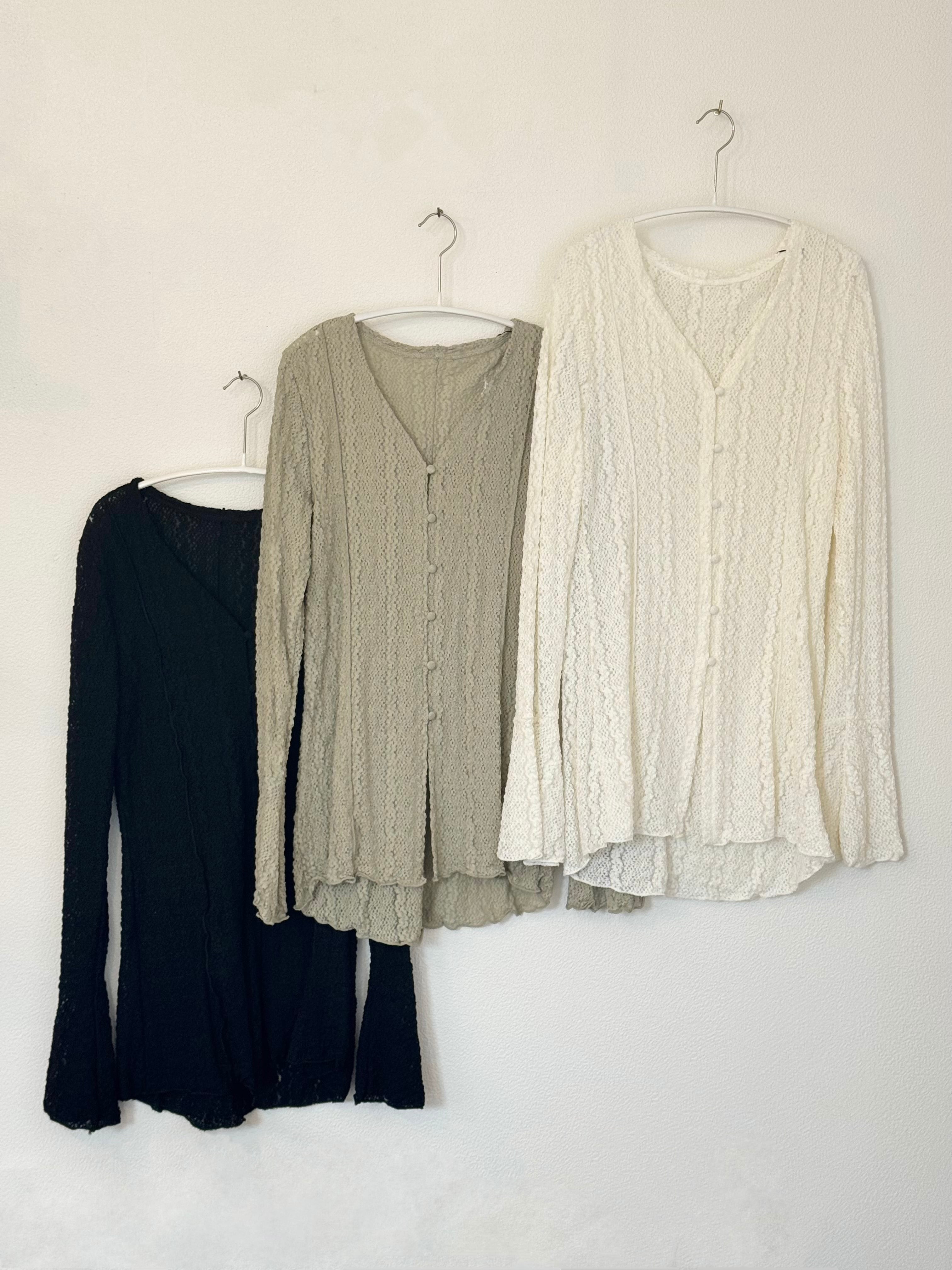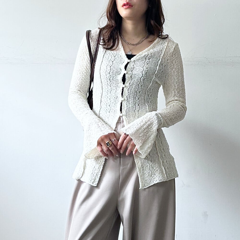 フレアスリーブとくるみボタンが柔らかい雰囲気を演出、