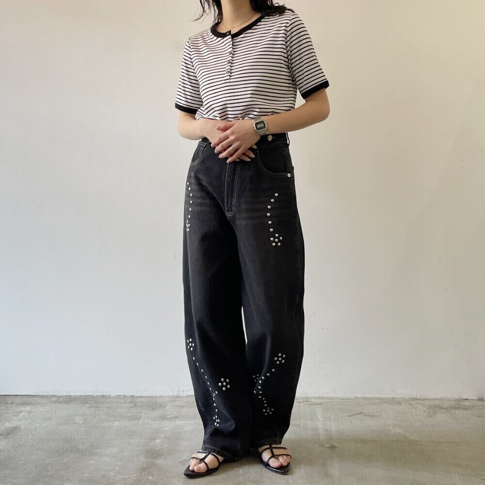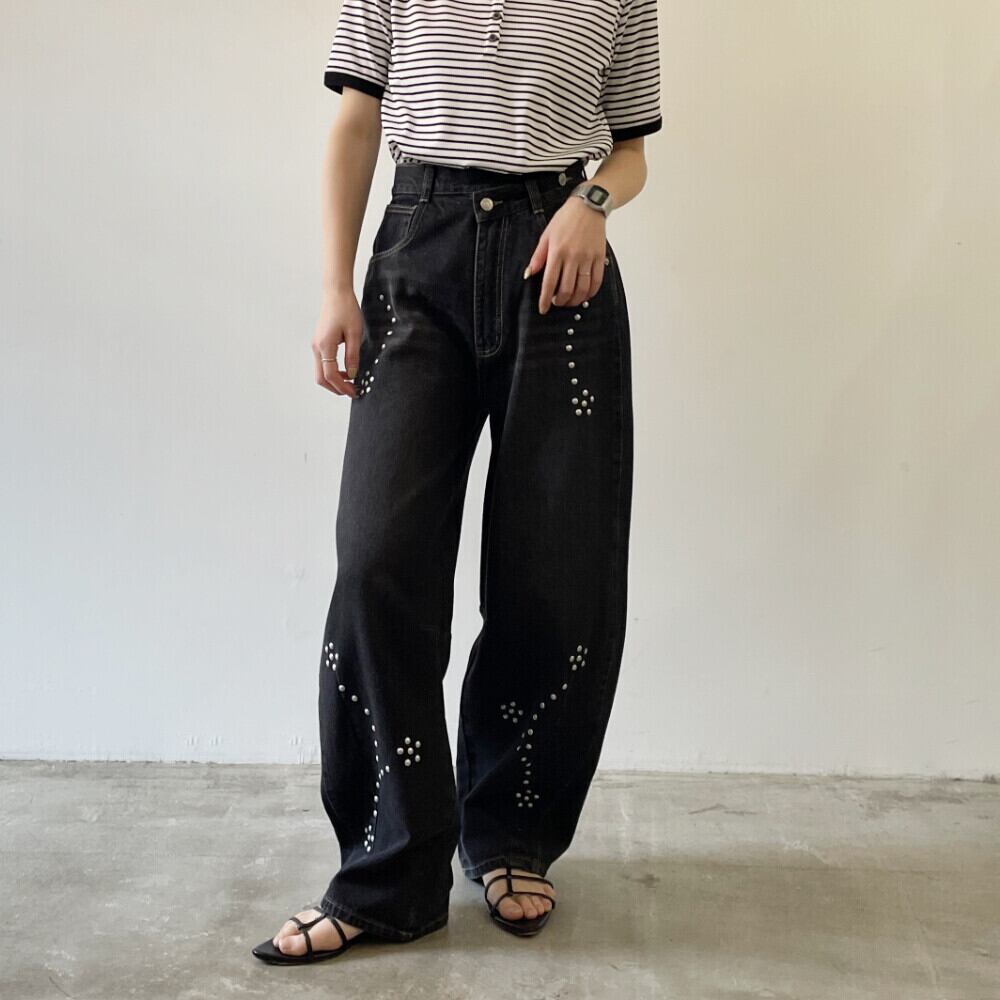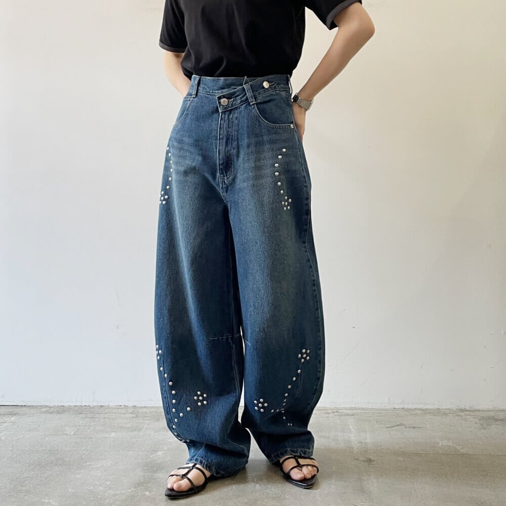 ・シルバースタッズがポイントになったカーブシルエットデニム。