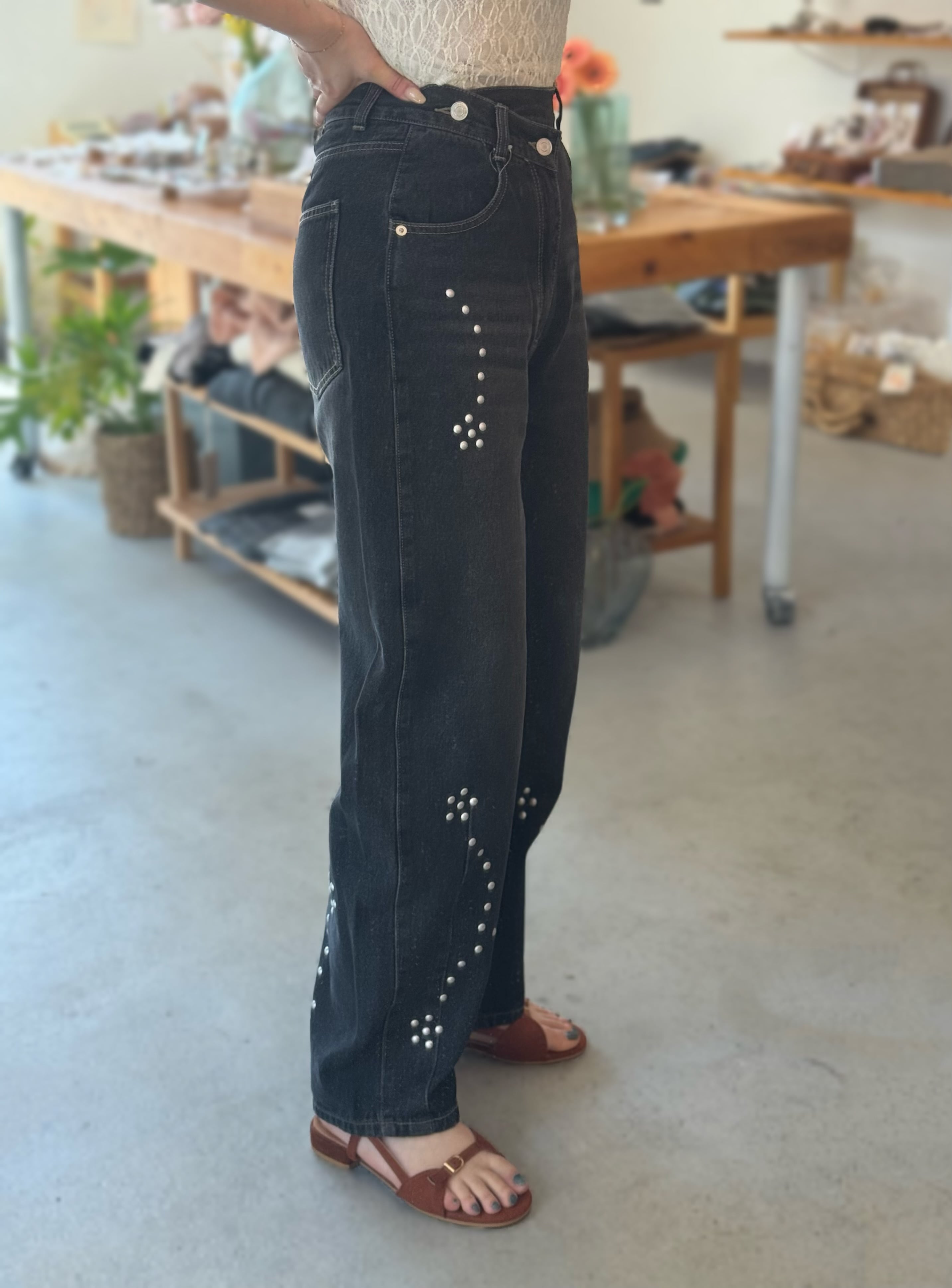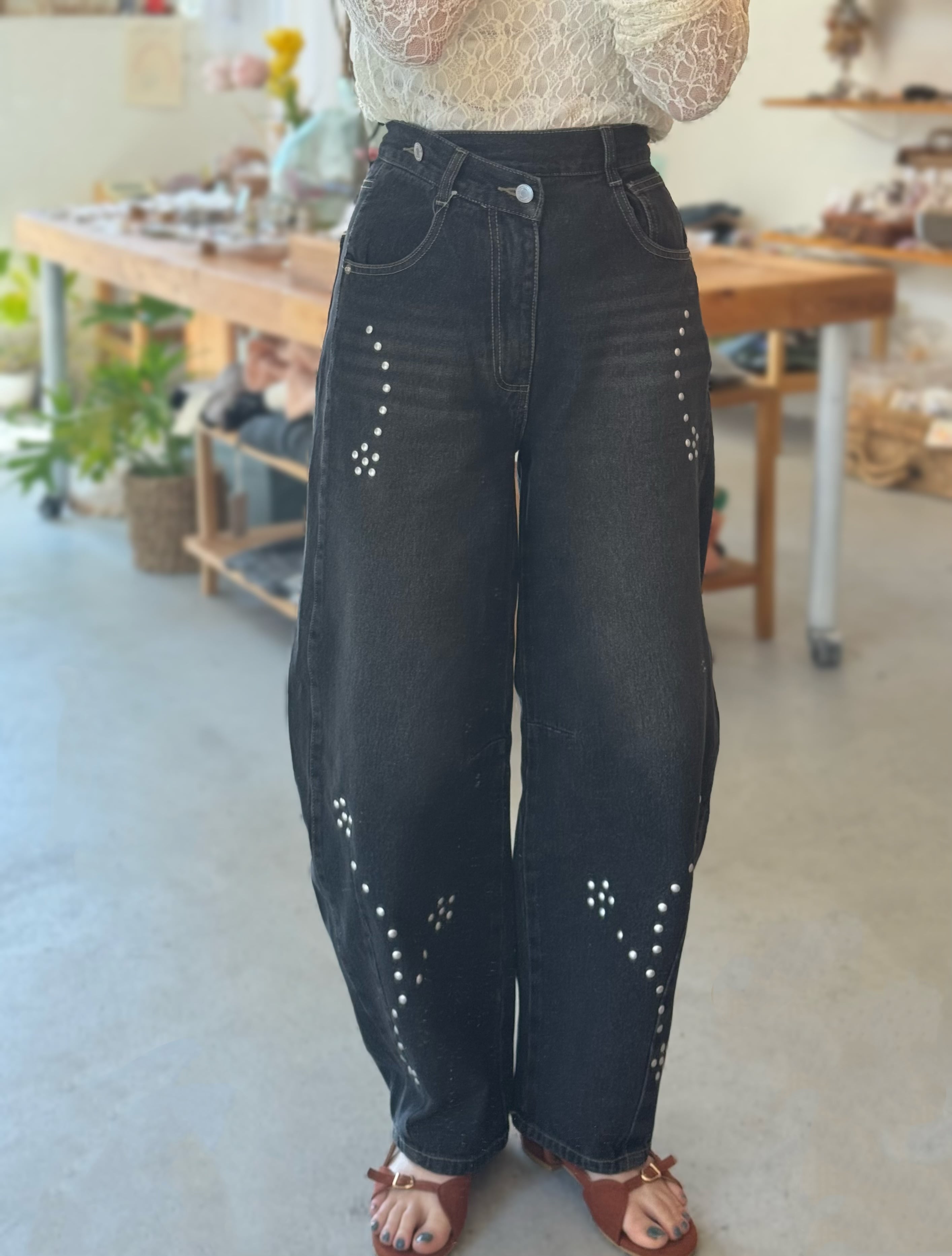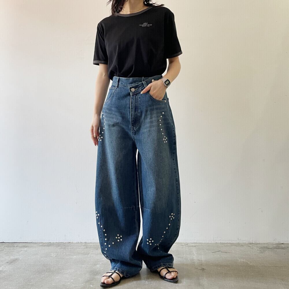 ・シルバースタッズがポイントになったカーブシルエットデニム。
