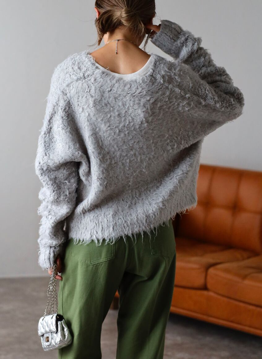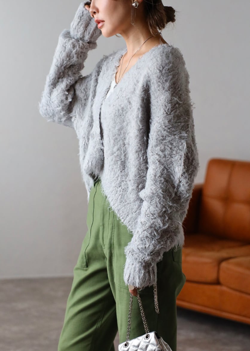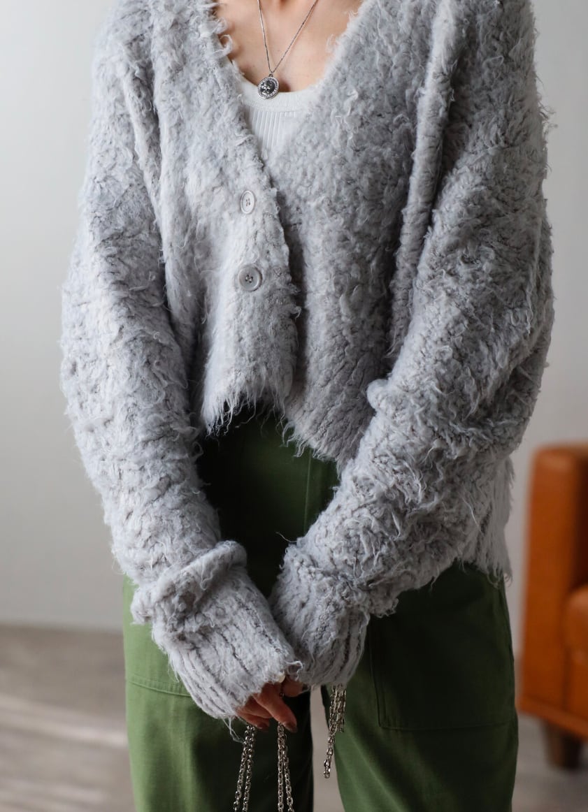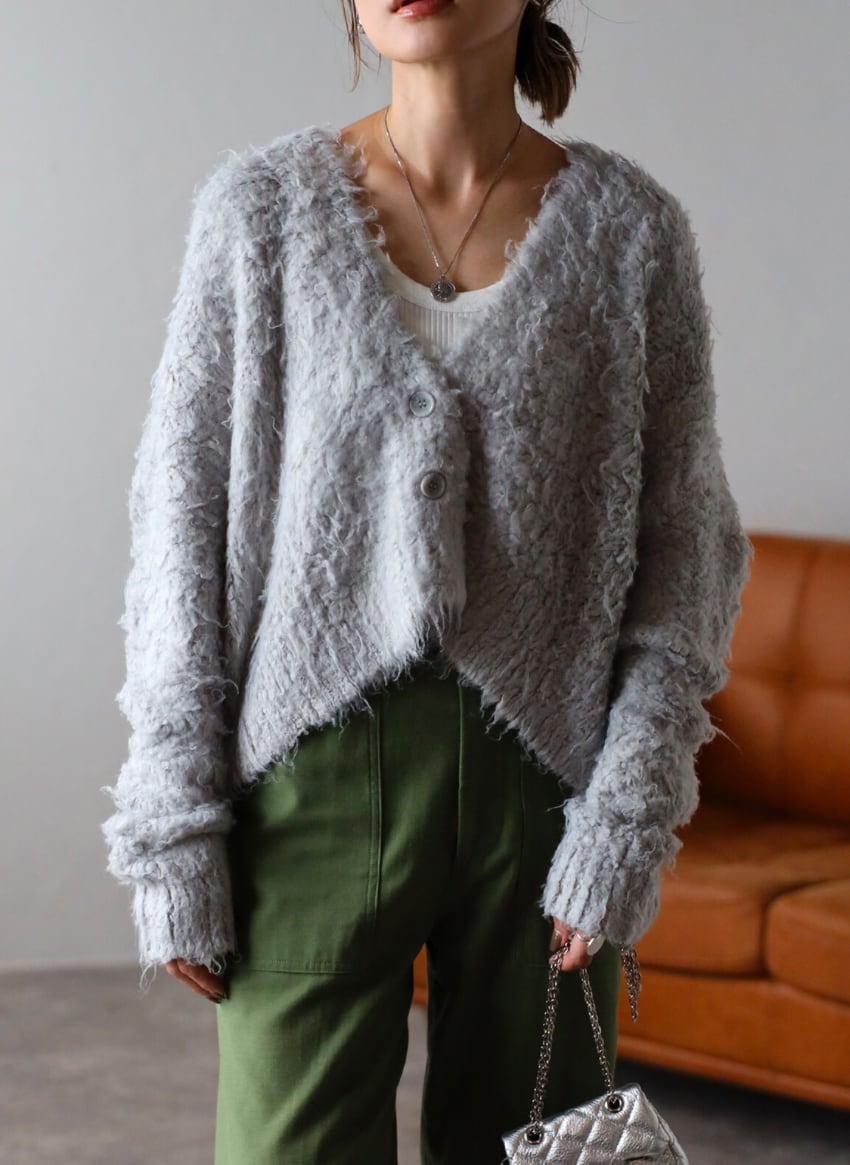ゆったりとしたシルエットのブークレー素材が印象的なニットカーディガン。